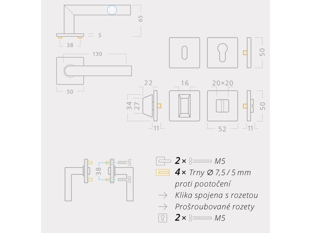 | Dveřní kliky - tvar rozety/štítu: | Hranatá rozeta |