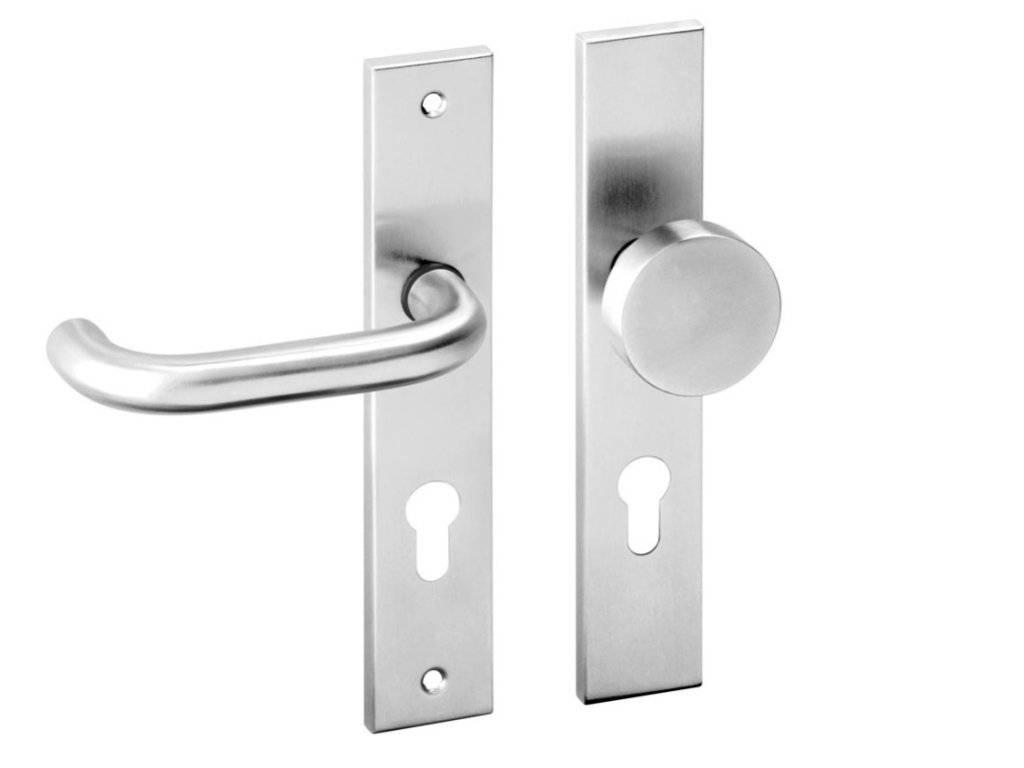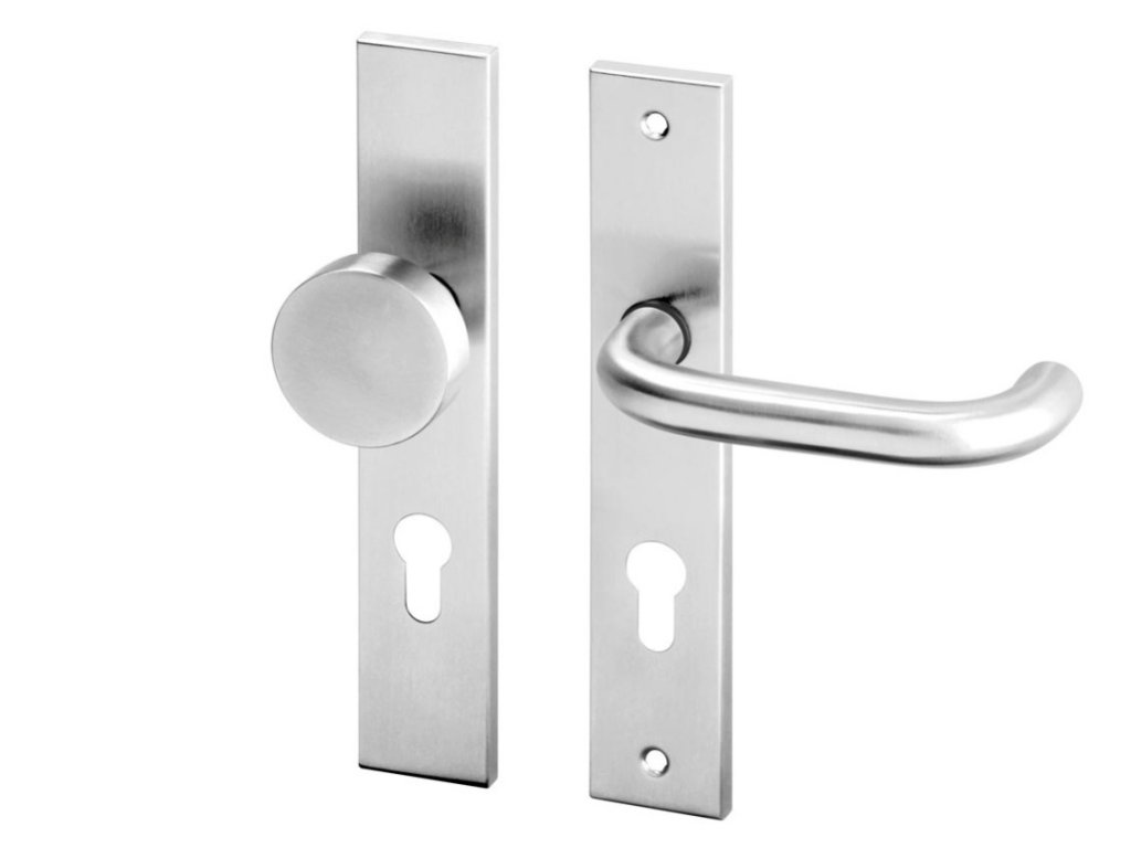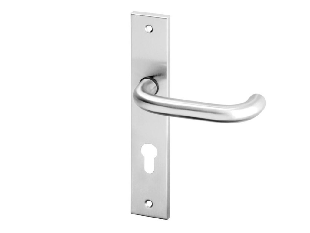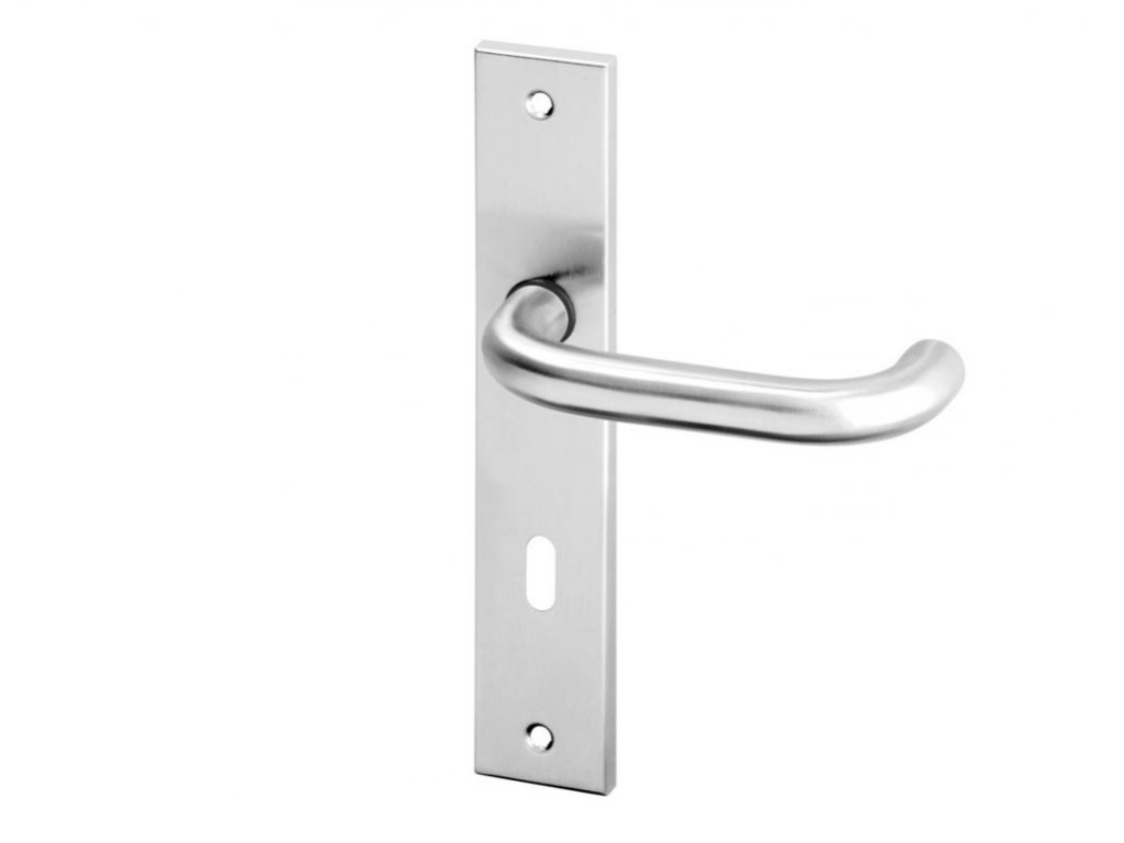 Moderní dveřní kování do interiéru - štítková klika hranatá na dveře s jemným zaoblením.