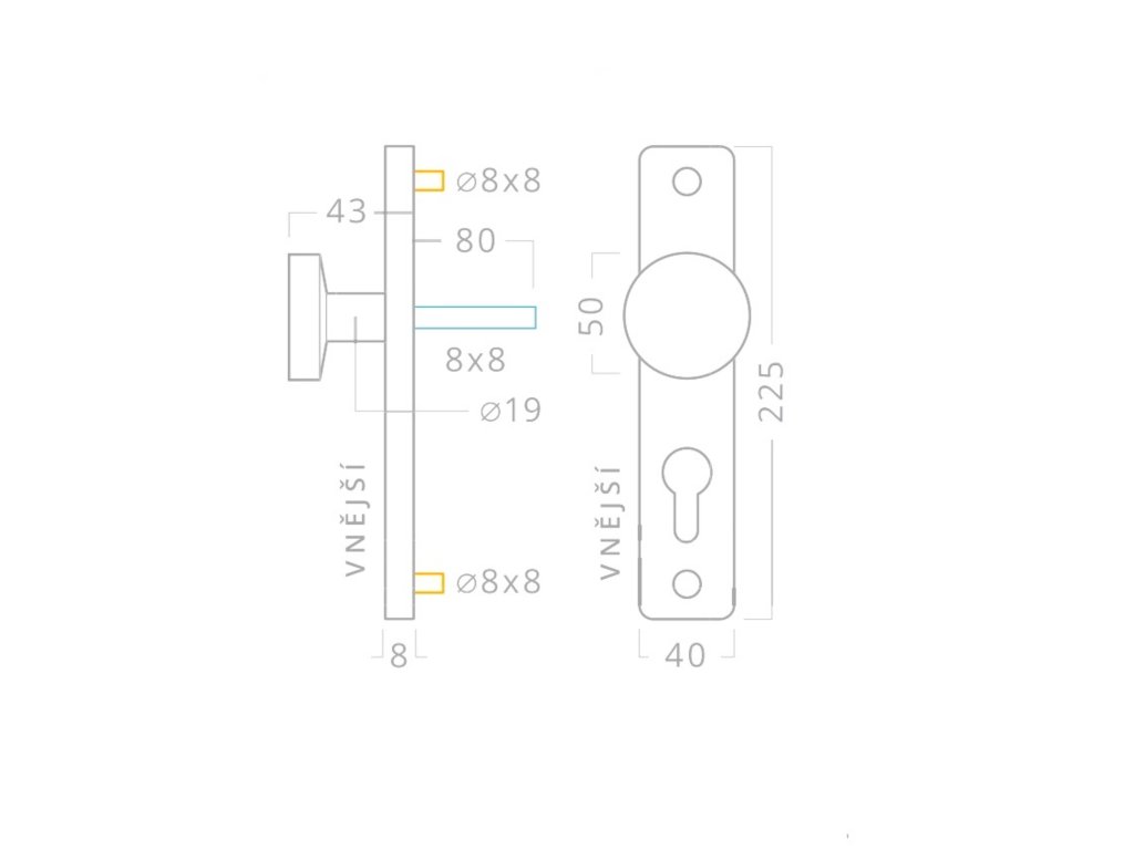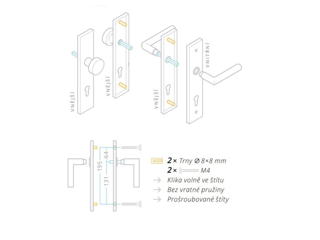 Klika je volně ve štítu bez vratné pružiny. S trny proti pootočení. Štíty jsou prošroubované skrz dveře.