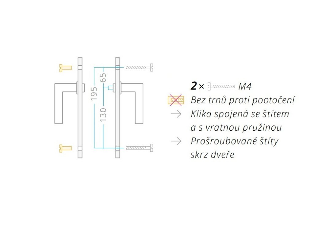 Klika je spojená se štítem a s vratnou pružinou. Bez trnů proti pootočení. Štíty jsou prošroubované skrz dveře.