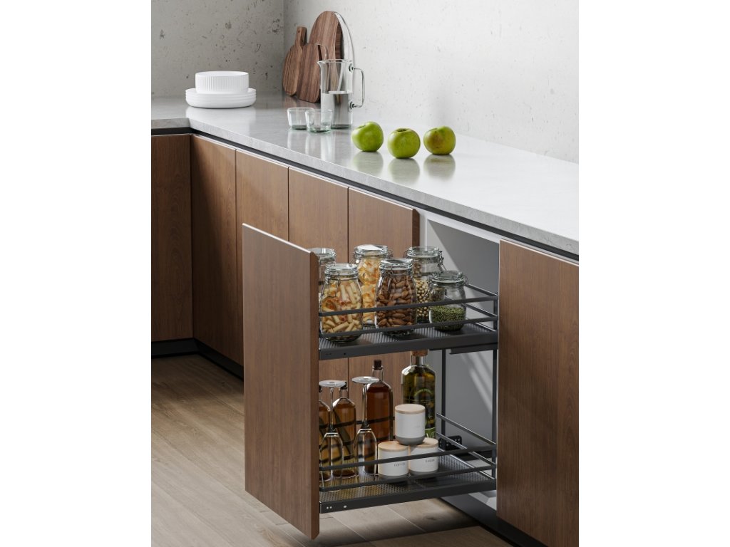 Dvoupatrový boční koš, který má lehký a tichý chod a je pro korpus o šířce 300 mm. Maximální zatížení koše je 30 kg.