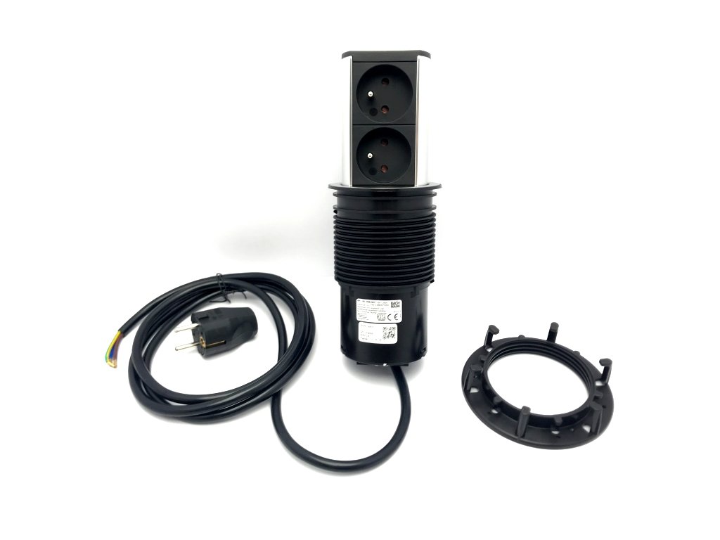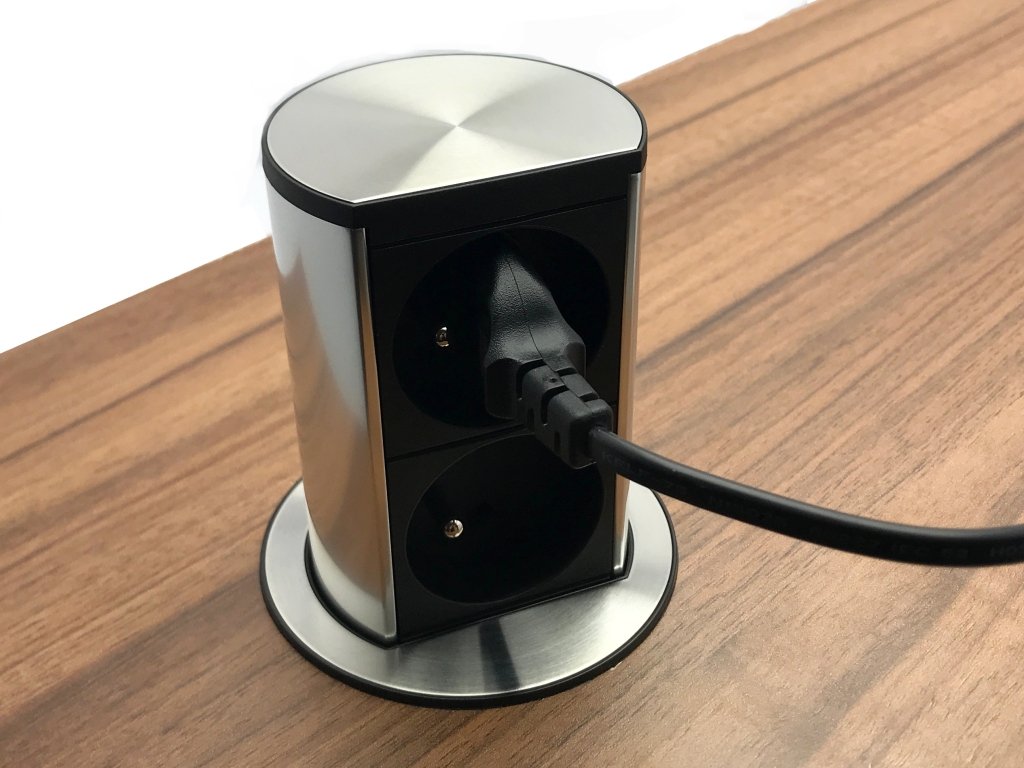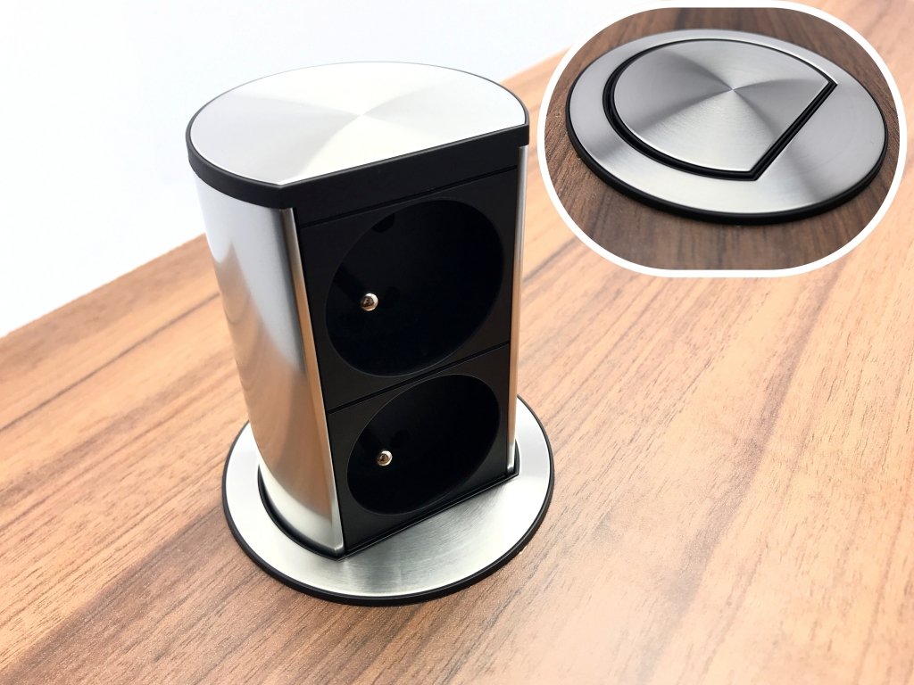 Zápustná elektro zásuvka Bachmann Elevator Vám vše vyřeší. Je vybavena 2x 230V zásuvkou a díky kompaktnímu designu neruší linie nábytku. Instalace je jednoduchá - do otvoru 80 mm vložíte zásuvku, ze spodní strany přišroubujete pojišťovacím kroužkem, zajistíte kabeláž a je hotovo.