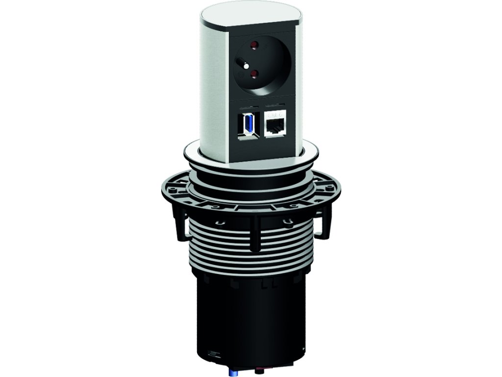Zápustná elektro zásuvka Bachmann Elevator OFFICE Vám vše vyřeší, vybavena 1x RJ45 síťovým kabelem, 1x USB datovým připojením, 1x 230V hnízdem, díky kompaktnímu designu neruší linie nábytku. Instalace je neuvěřitelně jednoduchá - do otvoru 80 mm, který si můžete připravit zapůjčením příslušného vrtáku (viz. níže), vložíte zásuvku ze spodní strany přišroubujete pojišťovacím kroužkem, zajistíte kabeláž a je hotovo. Použivání je stejně jednoduché pouhým zatlačením na víko zásuvky se jednotka vysune a je připravena k použití, zasunete jednoduše zatlačením směrem dolů.