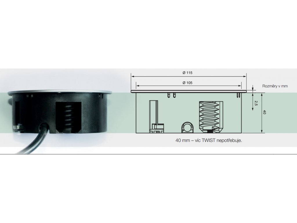 - prostorově velmi úsporná zásuvka (HxØ: 42,5 × 115 mm)