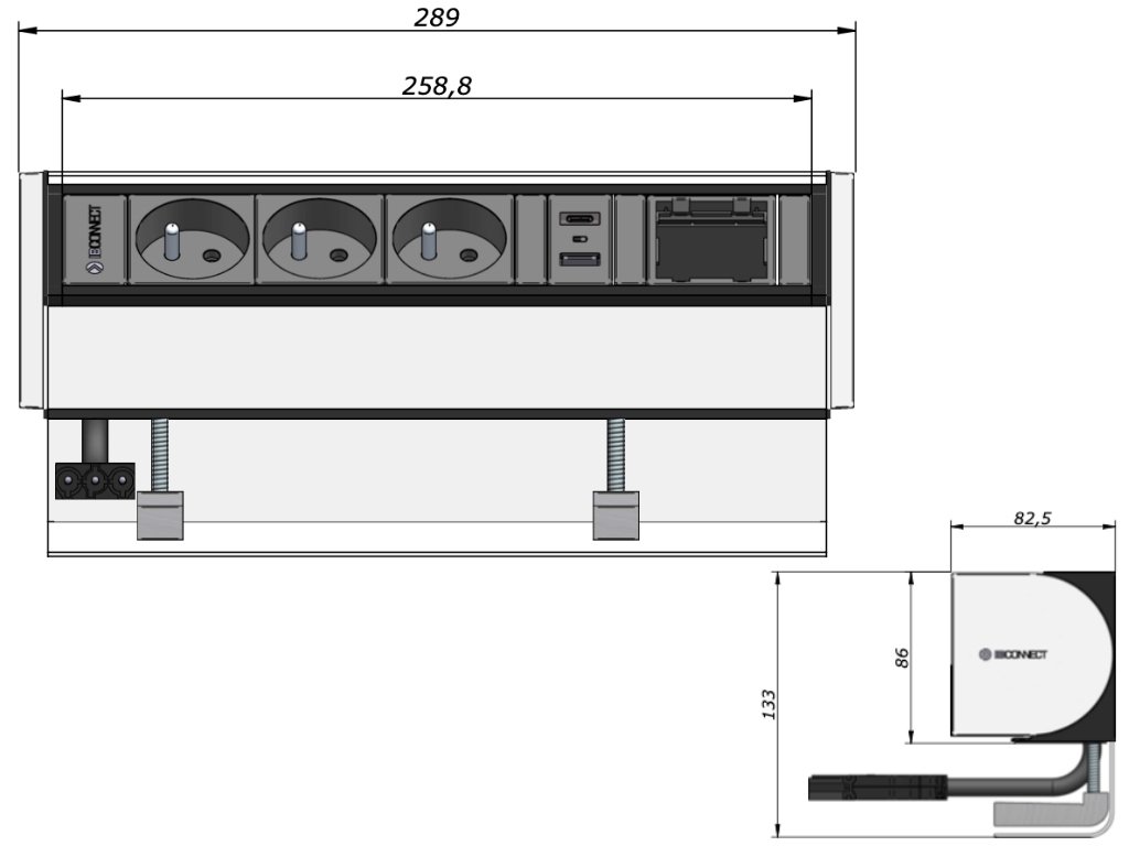 Elektro zásuvka PRISMA je určená pro montáž na hranu stolu nebo jiné pracovní plochy pomocí montážních úhelníků, které jsou součásti balení. Je určená pro tloušťku stolu 1 - 30 mm.