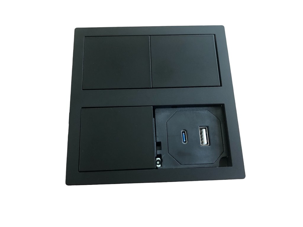 Designová zásuvka, která lze využít v různých typech místností i nábytků. Jedná se o uzavřený modul, který lze montovat i do měkkých materiálů jako jsou například sedačky.