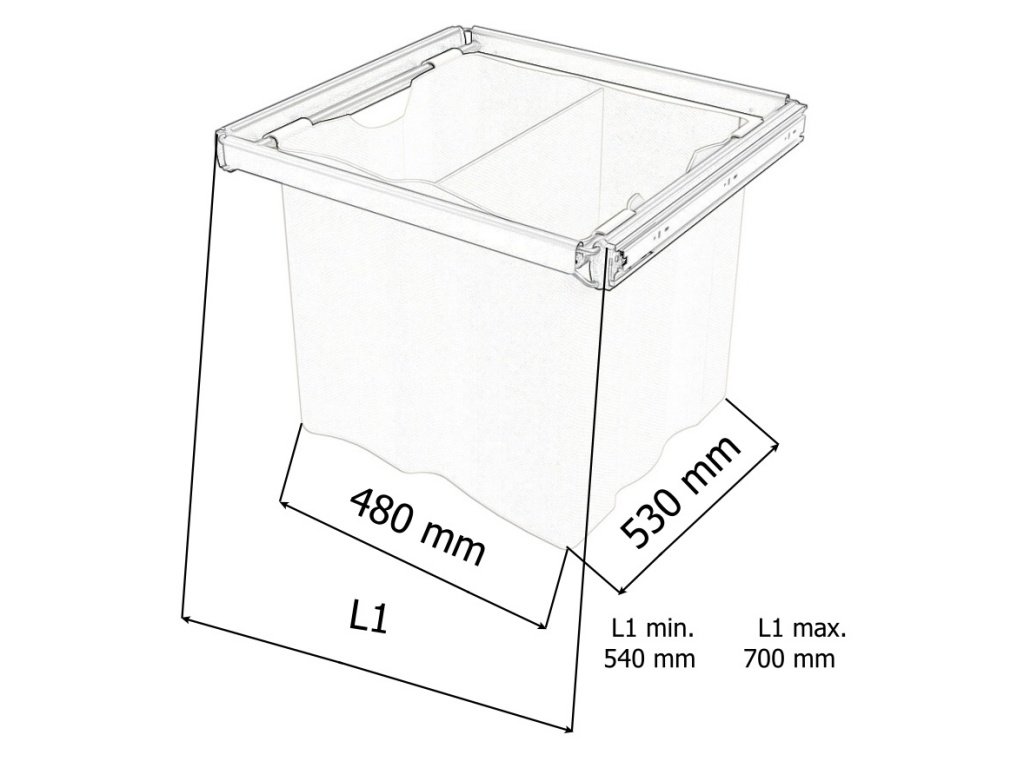 Koš na prádlo s rámem v barvě stříbrná. Prádelní koš má nastavitelnou minimální a maximální šířku korpusu, tudíž si ho můžete vhodně nastavit podle Vaší potřeby.