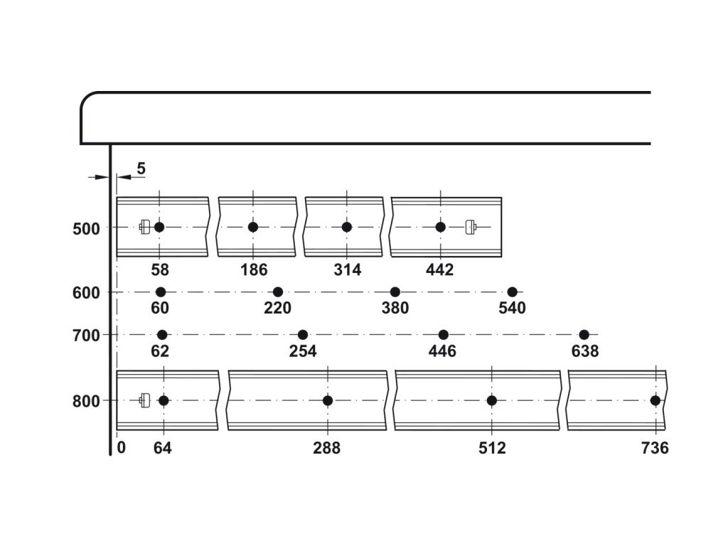| Výsuvy - jmenovitá délka: | 500 mm, 600 mm, 700 mm, 800 mm |