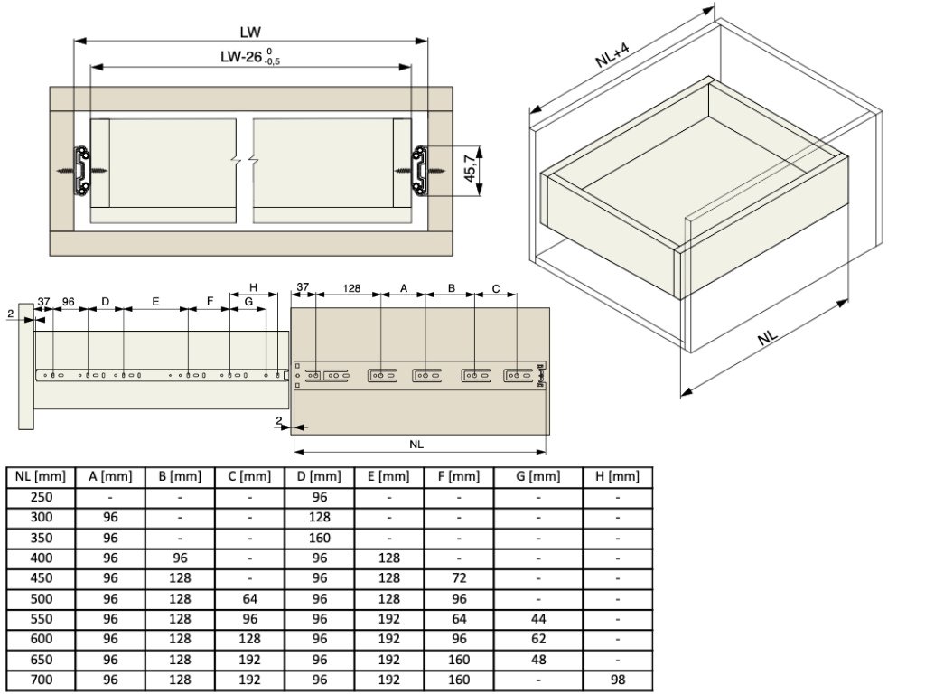 | Výsuvy - jmenovitá délka: | 300 mm, 350 mm, 400 mm, 450 mm, 500 mm, 550 mm, 600 mm, 700 mm, 250 mm |