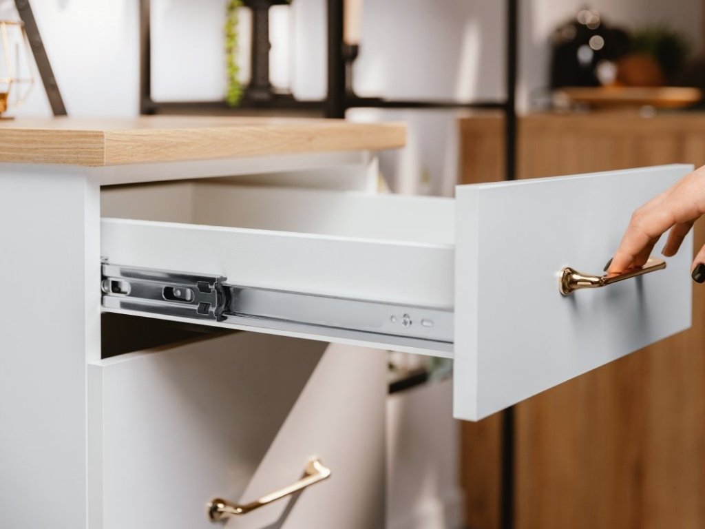 Výsuv se skládá ze 2 části, které lze za pomocí pojistky oddělit a zásuvka (šuplík) tak lze jednoduše demontovat.