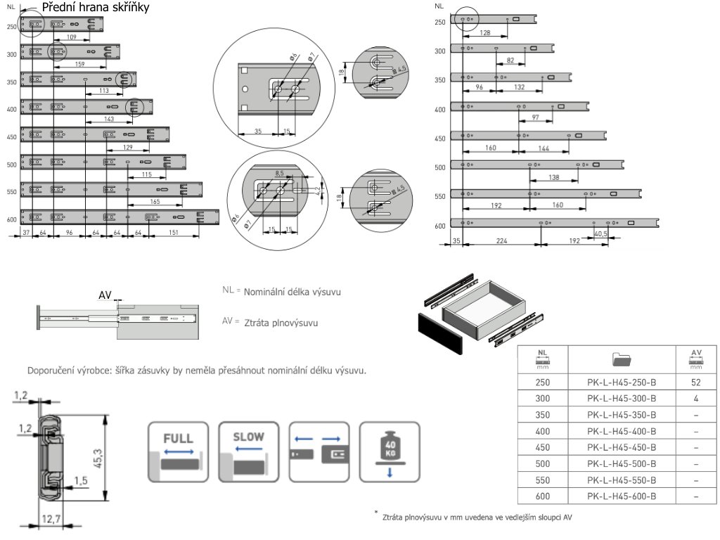 Výsuvy - jmenovitá délka: | 300 mm, 350 mm, 400 mm, 450 mm, 500 mm, 550 mm, 600 mm, 250 mm |