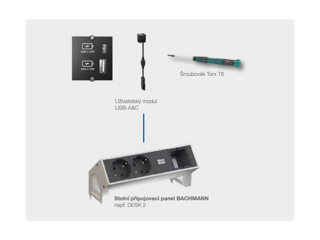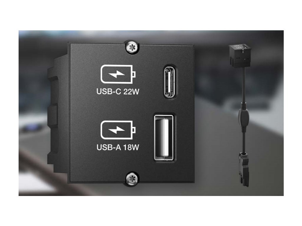 modul k zabudování do uživatelského modulu v zásuvkové jednotce. Modul je vybaven USB nabíječkou 1x USB "A" (při 5V - 3A) a 1x USB "C" (při 5V - 3A). Modul se připojuje na napájení 230V, v modulu je již obsažen transformátor.