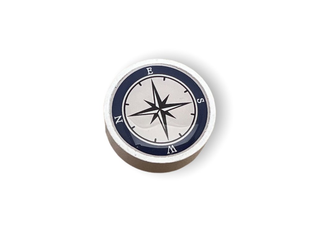 Barevné provedení bílého laku v kombinaci s motivem kompasu. Knopka se montuje jednoduše, pomocí přibaleného šroubu délky 22 mm.