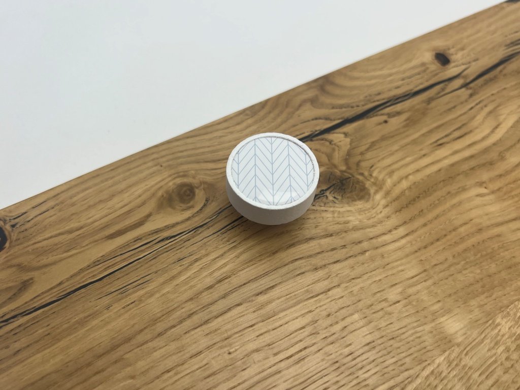 Barevné provedení bílého laku v kombinaci s motivem stopy jedle. Knopka se montuje jednoduše, pomocí přibaleného šroubu délky 22 mm.