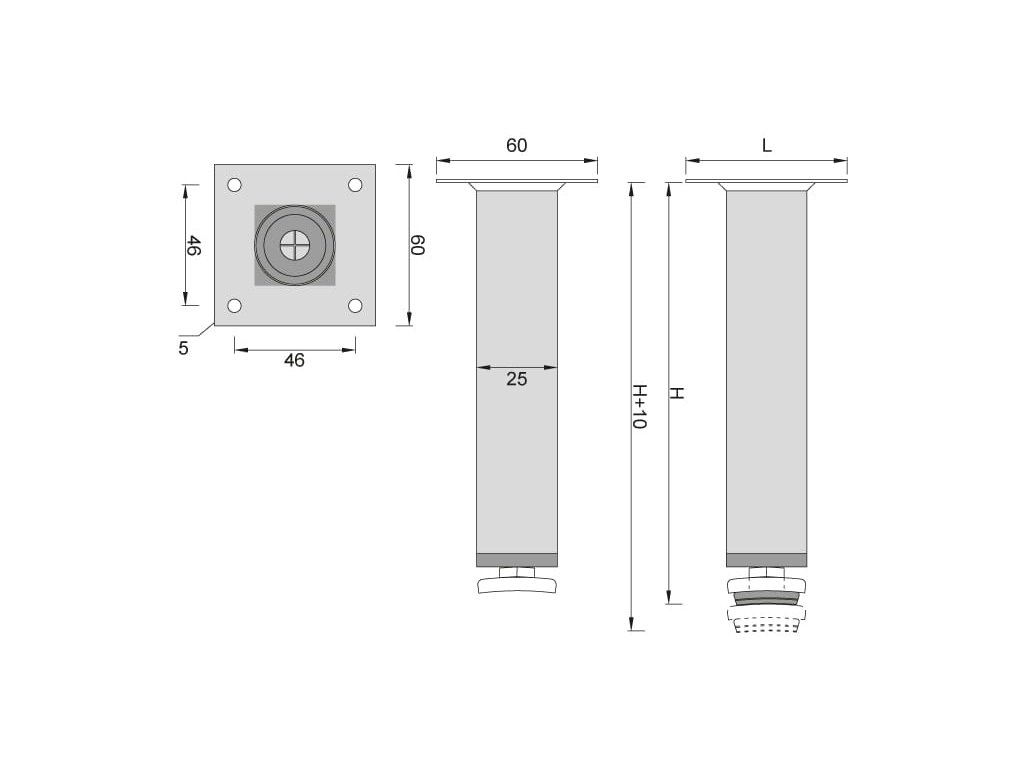 Hranatá nábytková ocelová nožka. S plotničkou a rektifikací + 10 mm.