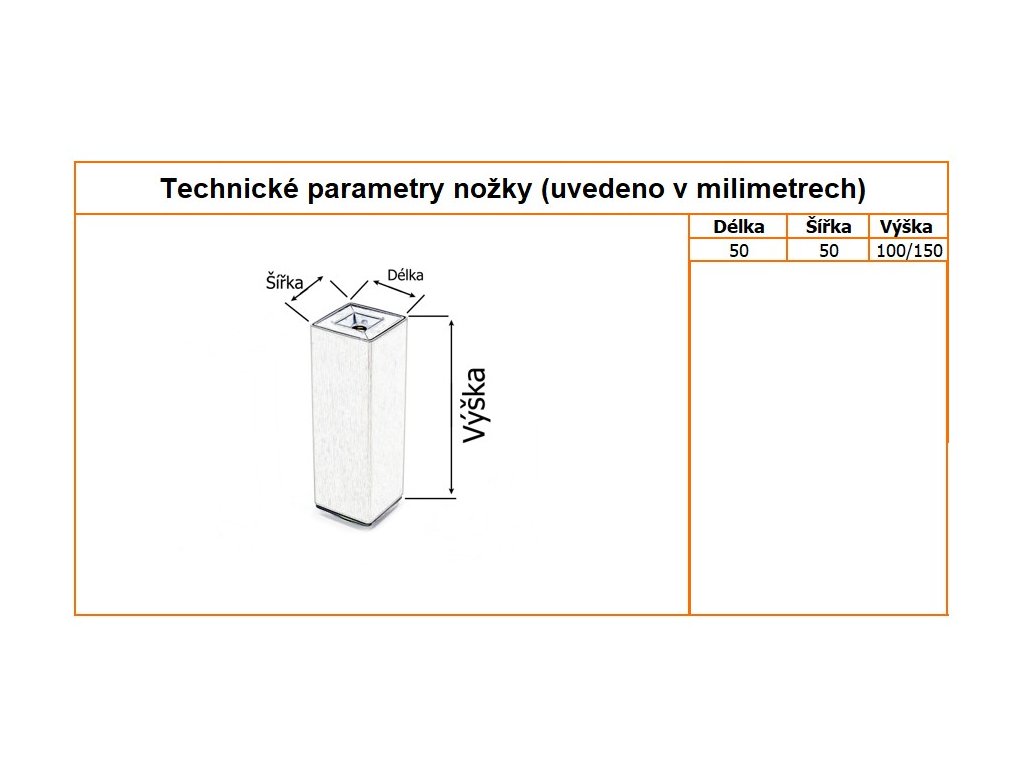 | Rozměry nožky | 50x50, výška 100 | 50x50, výška 150 mm |