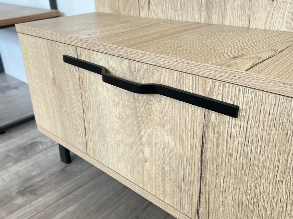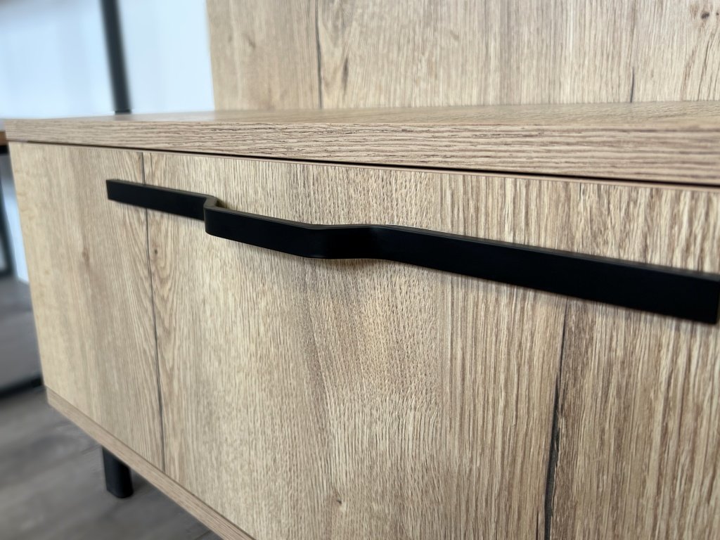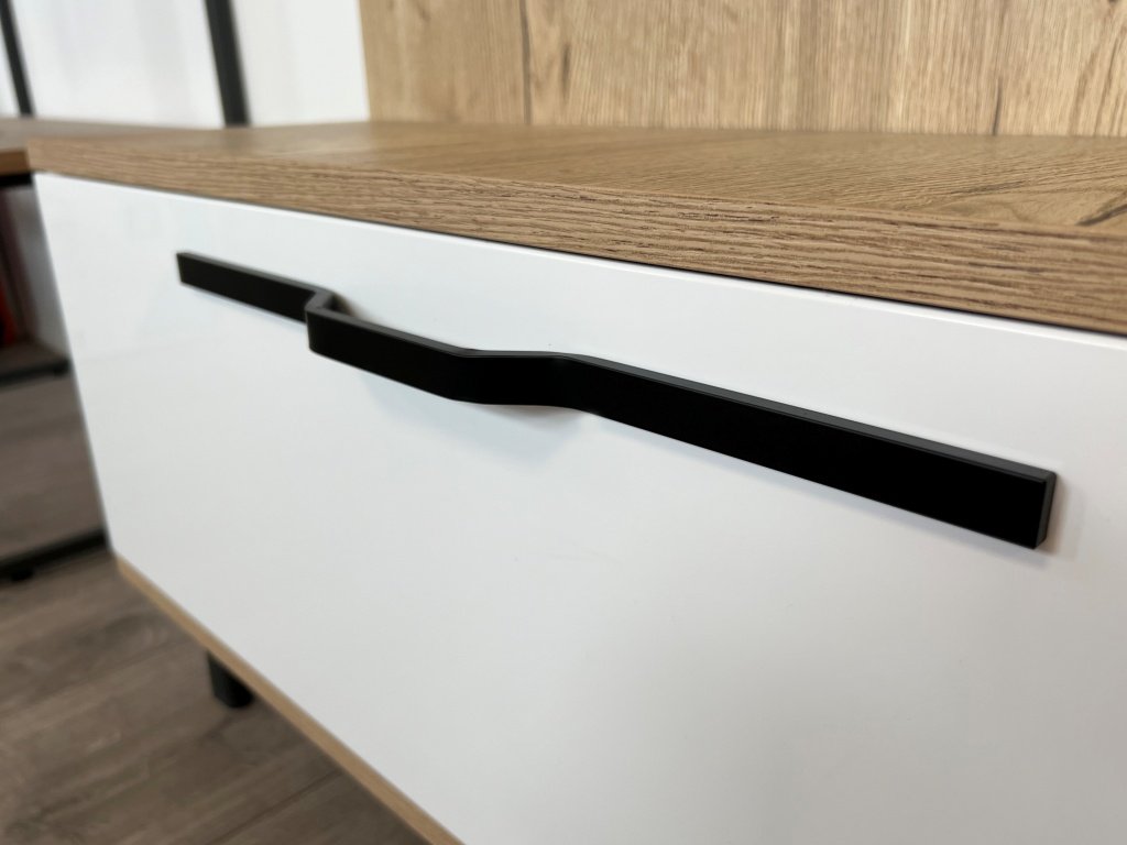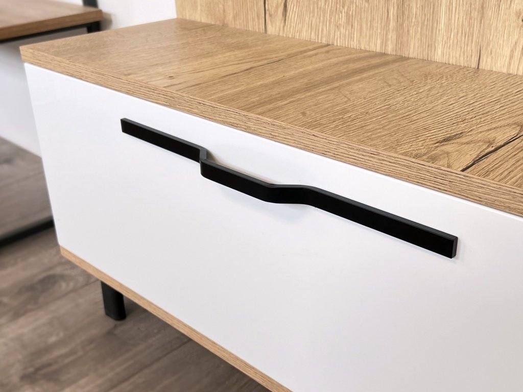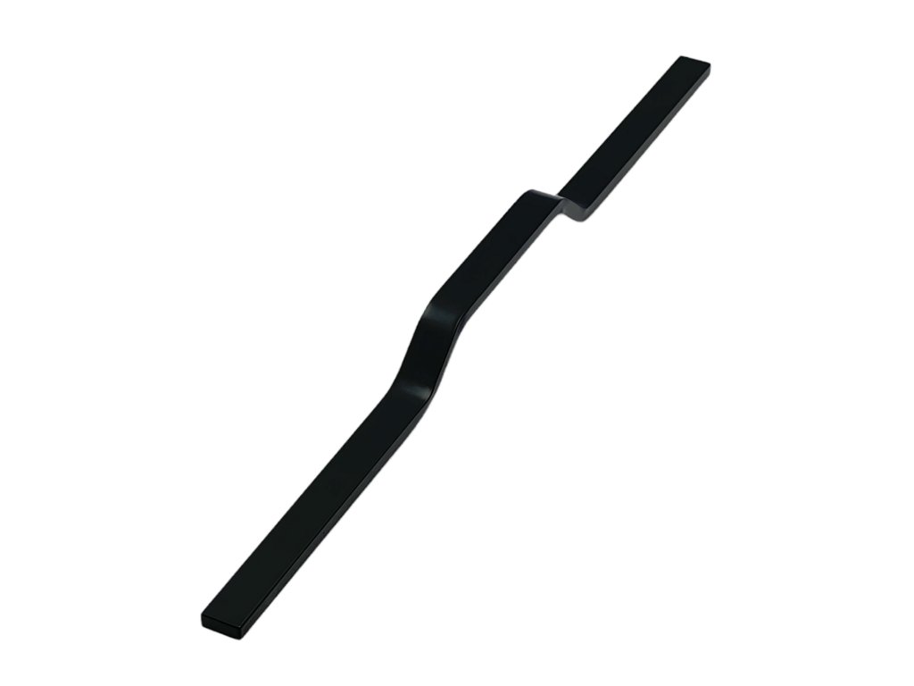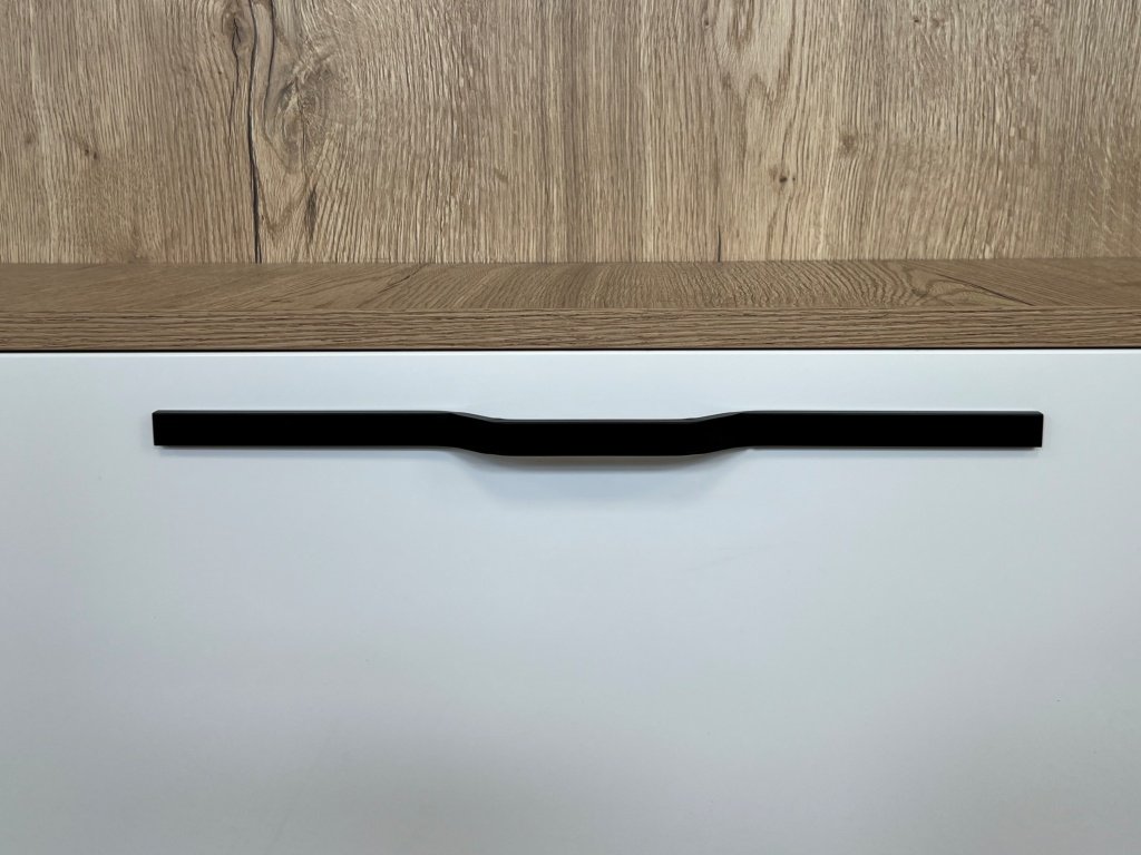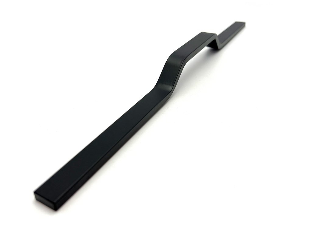 Moderní kovová úchytka s trendy povrchovou úpravou - strukturovaná černá matná. Tato barva vynikne zejména na dvířkách v dekoru dřeva, nicméně na světlých, univerzálních barvách se také neztratí. Skvělý kontrast k bílým dvířkám.