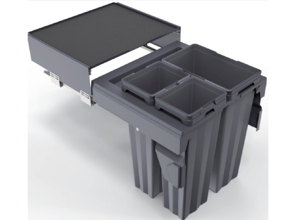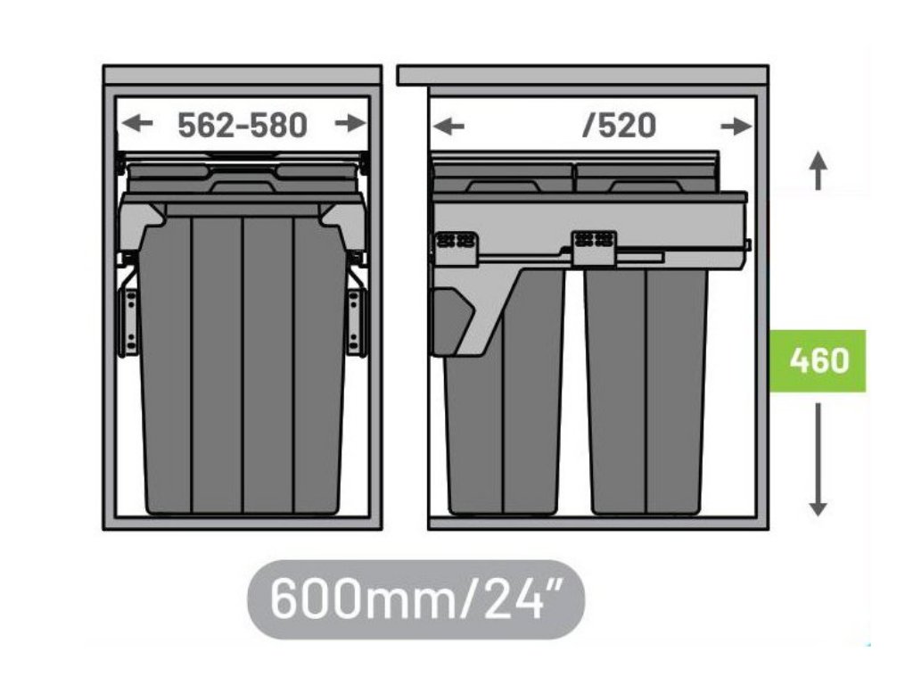 Koš má 2 nádoby o objemu 13 L a 1 nádoba o objemu 28 L. Nádoby lze vyndávat a vynášet pomocí sklopných uší. Výška zabudování nad dnem zásuvky je 460 mm a hloubka zabudování 520 mm. Vnitřní šířka 562 - 580 mm.