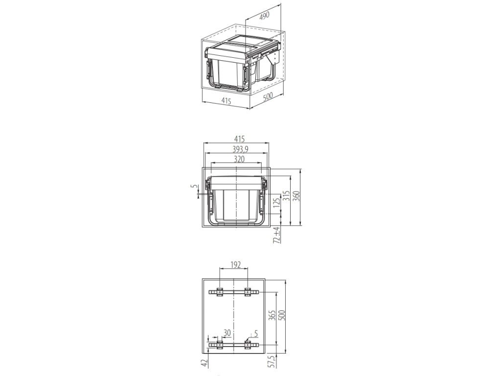 Odpadkový koš určený do kuchyňské skříňky s minimální vnější šířkou 450 mm (lze použít i pro širší skříňky), u které se dvířka otevírají pomocí závěsů (pantů). Součástí balení je také montážní materiál. Montáž se provádí do dna skříňky.