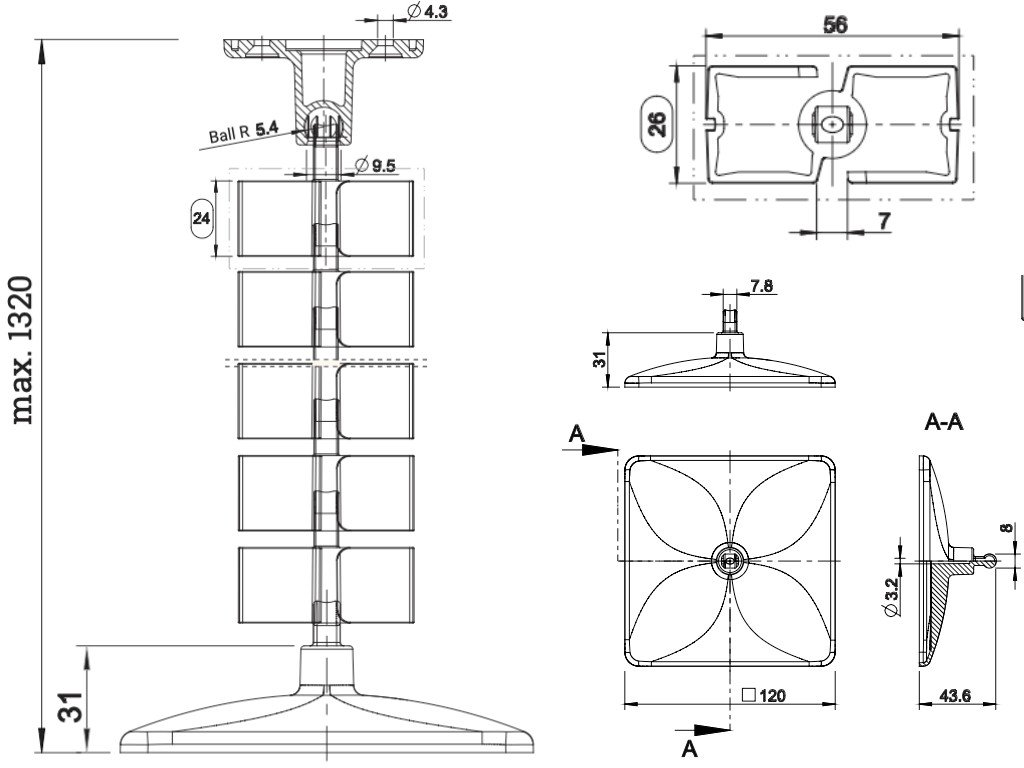 Maximální délka je 1320 mm, v případě potřeby delšího vedení lze napojit i více organizátoru do sebe. Vedení má 38 části a každá má 2 komory pro vedení kabelů.