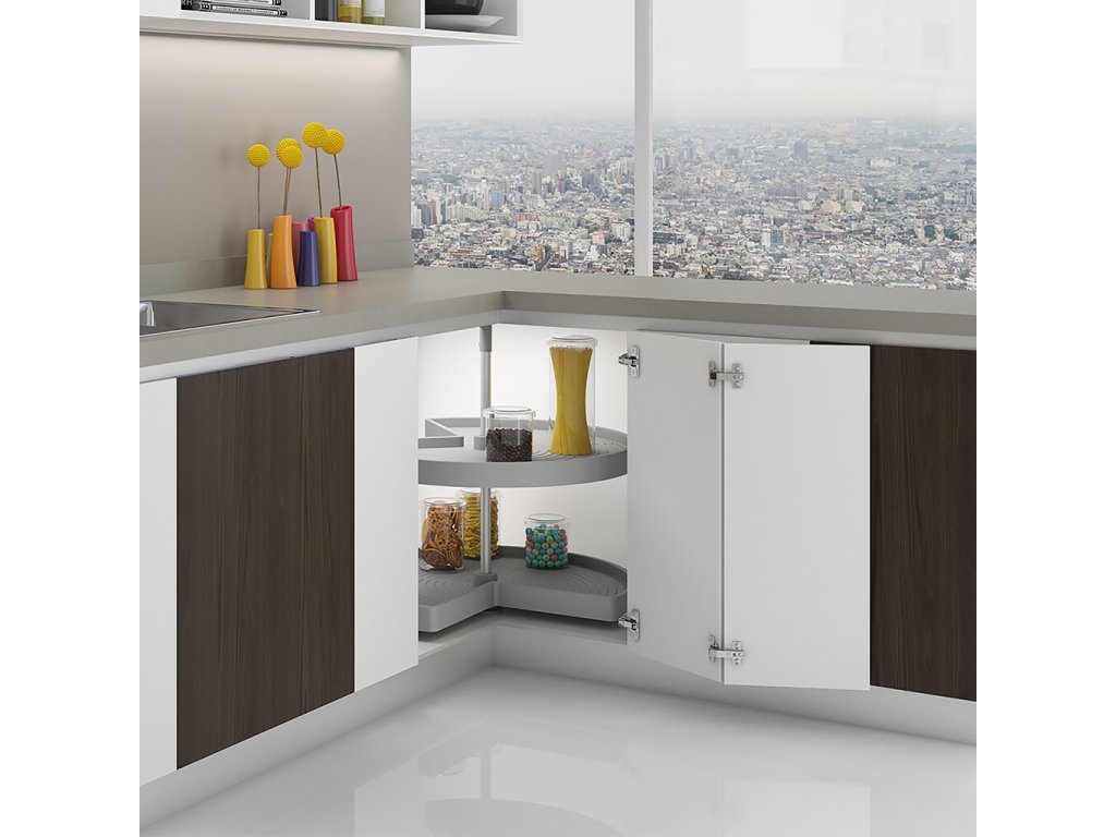 Pár otočných polic Shelvo 3/4 promění roh vaší kuchyňské skříňky o šířce 80 cm v přehledný a snadno přístupný úložný prostor. Díky ergonomickému designu můžete celý obsah pohodlně vytáhnout do prostoru, aniž byste se museli ohýbat nebo sahat do hloubky rohu.