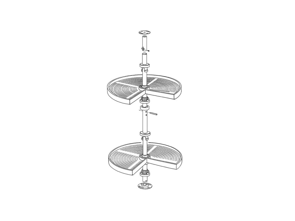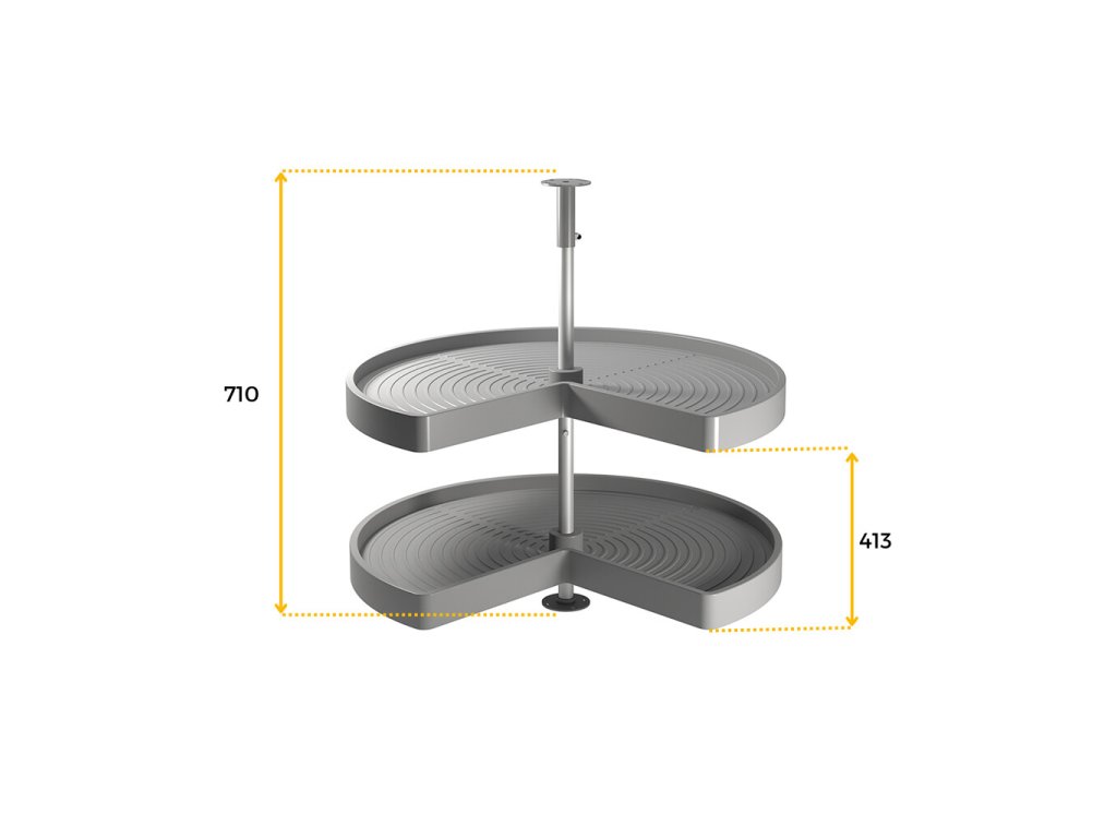 Police o průměru 810 mm jsou vyrobeny z šedého plastu – odolného vůči nárazu, vlhkosti. Centrální hliníková tyč s matnou anodizací umožňuje montáž ve výškách mezi 650 a 770 mm, bez nářadí a s dorazovým zarážkou pro bezpečné vysunutí. Každá police unese až 20 kg rovnoměrně rozloženého zatížení.