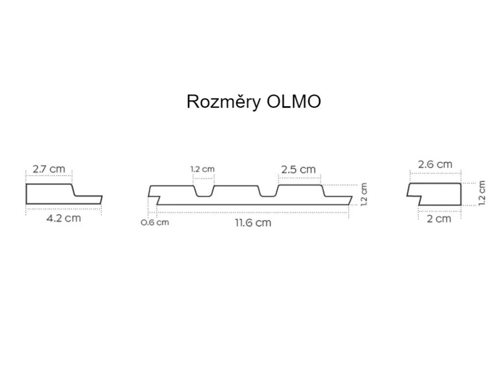 Viditelná šířka panelu je 11,6 cm, celkové překrytí mezi panely je tedy 6 mm. Na běžný metr použijete cca 9 panelů (celková šířka 108,50 cm bez řezání).