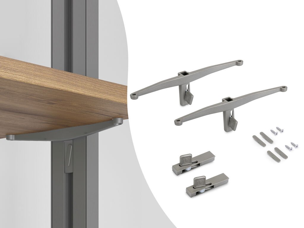 Univerzální sada držáků pro dřevěnou polici se instaluje velmi jednoduše nasazením do profilu bez nářadí. Produktové video Vám tento proces přiblíží. Dá se také jednoduše nastavovat na výšku a srovnávat do vodorovné polohy. Police se instaluje jednoduše pomocí vrutů.