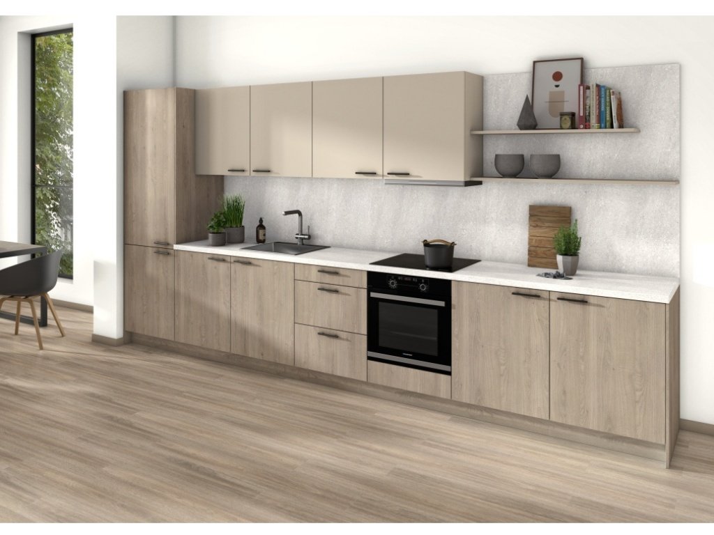 pracovní deska do kuchyně, vyrobena ze surové dřevotřísky potažené laminátem po celé horní straně, přes hranu až po část spodní strany desky. Je tak zachována celistvost a bezešvý ráz laminátu.