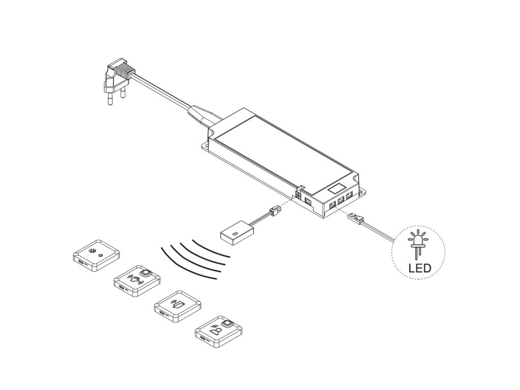 Přijímač lze snadno propojit s LED senzory nebo dalšími doplňky ze série Emuca Smart. Díky kompaktním rozměrům jej lze umístit přímo do nábytku, za lištu nebo do elektroinstalační krabice. Je ideální volbou pro modernizaci osvětlení v kuchyních, šatnách, výklencích i komerčních prostorech, kde se klade důraz na čistý design a snadné ovládání.