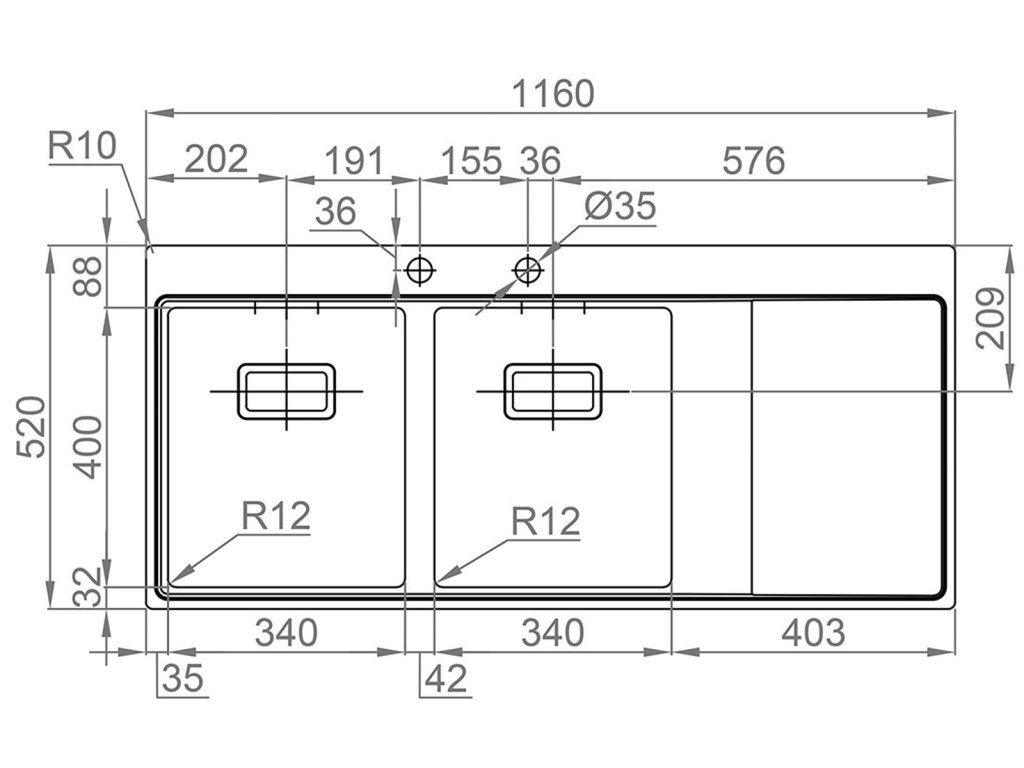 • Rozměr dřezu 1160 x 520 mm