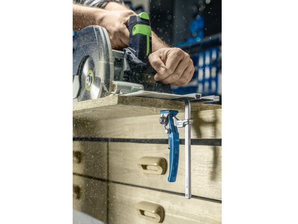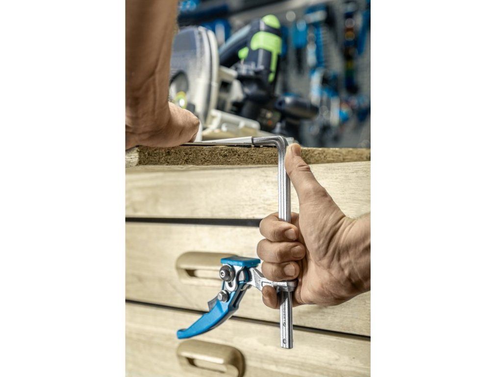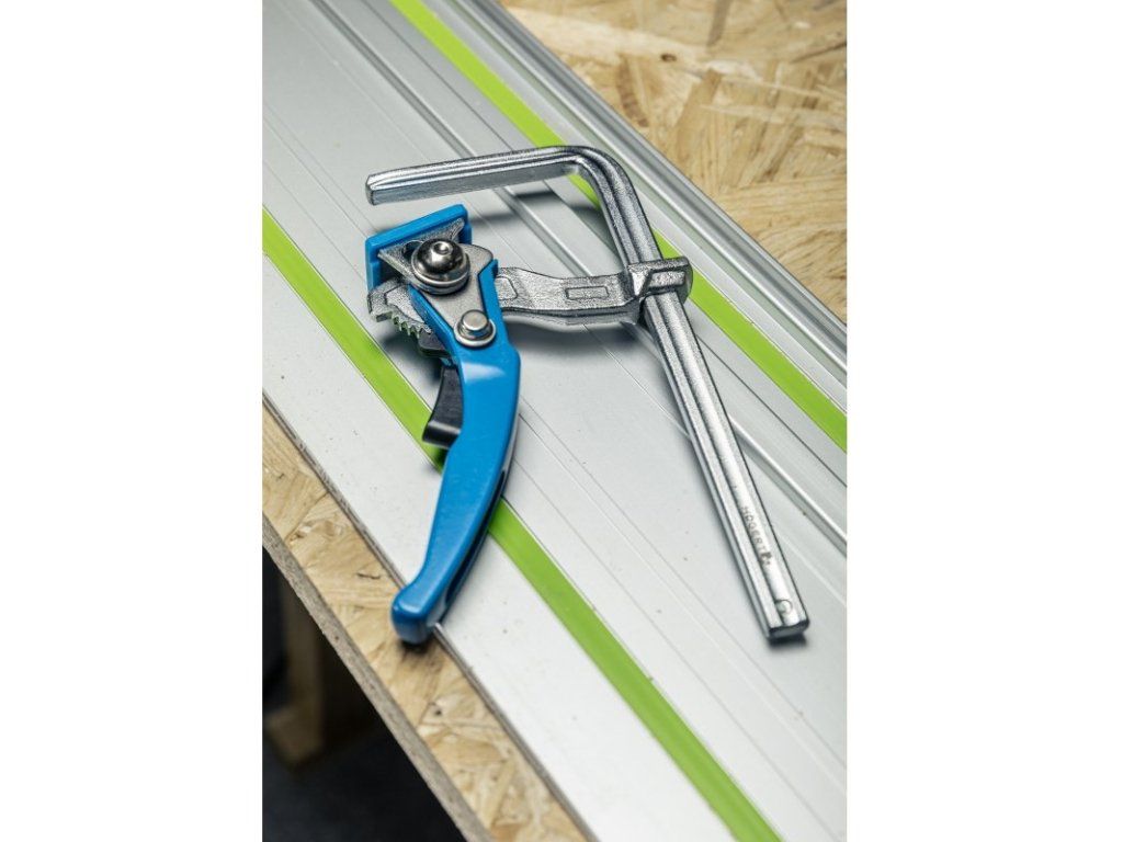 Páková svěrka umožňuje rychlé, bodové upevnění. Vhodné pro lepení a upevňování různých materiálů nebo různých součástí. Díky vysoké upínací síle se eliminuje vibrace při práci. Ideální k upevnění na pracovní stoly - profil ramene pro držáky 12x8 mm. Ideální pro upevnění vodících lišt značek - Feestol, Makita, Metabo, Milwaukee a Hikoki.