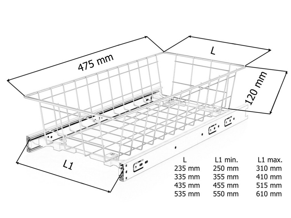 Maximální nastavitelná šířka: 310 mm, Minimální nastavitelná šířka: 250 mm, Šířka koše (mm): 235 mm