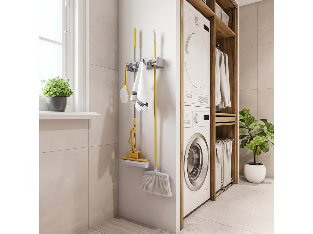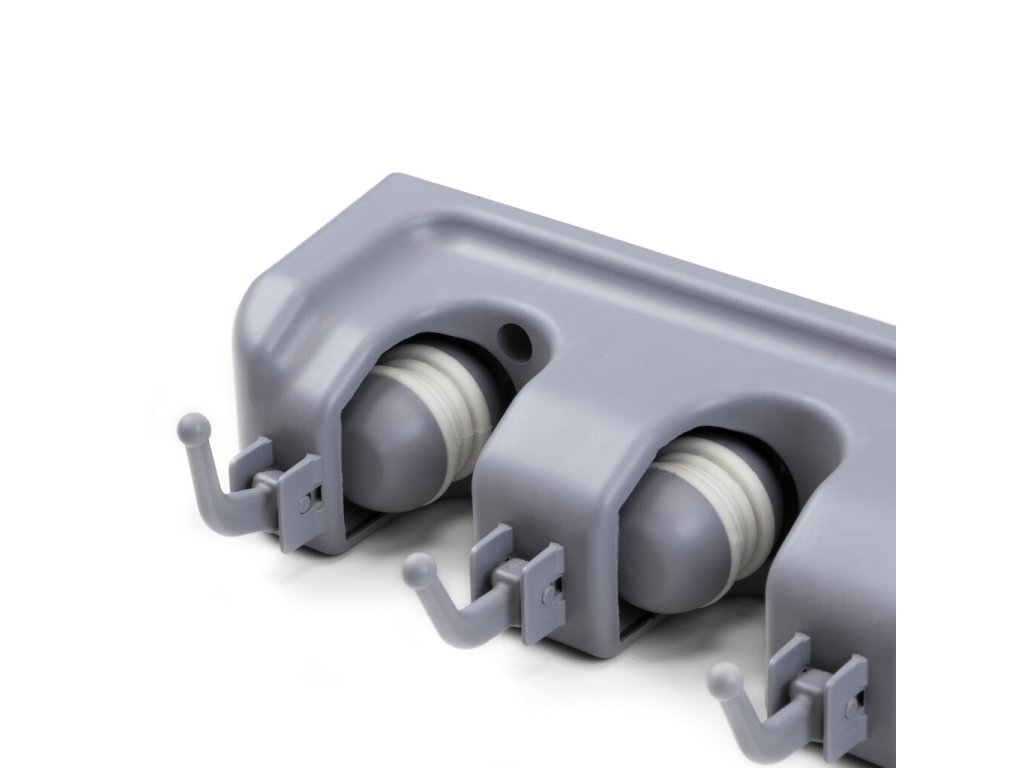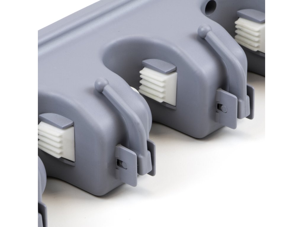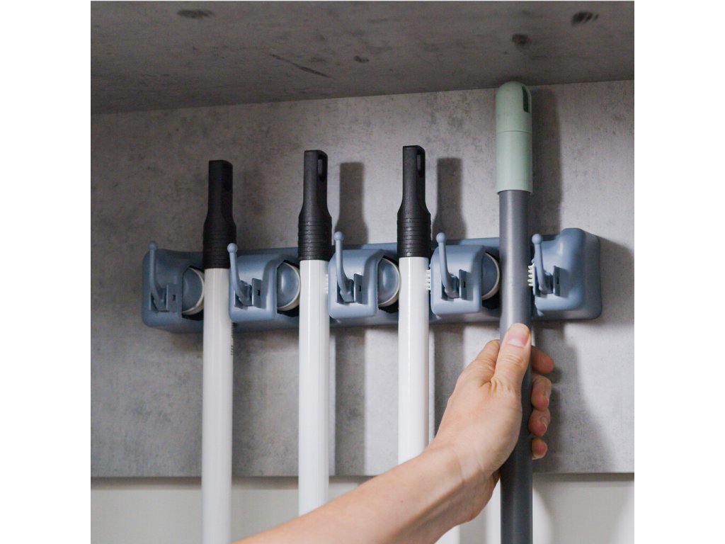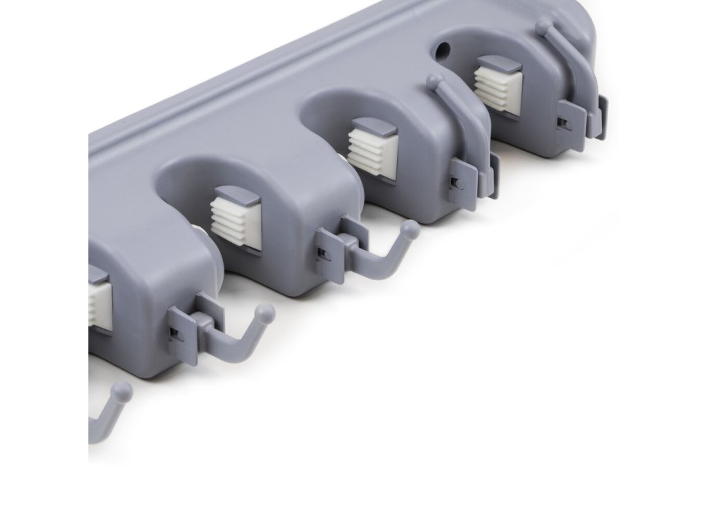 Tento nástěnný držák vám pomůže přehledně a efektivně uskladnit smetáky, mopy, lopatky, utěrky nebo další úklidové pomůcky. Díky čtyřem samosvorným drážkám s kuličkovým mechanismem bezpečně udrží násady různých průměrů. Navíc pět háků poslouží k zavěšení dalších pomůcek.
