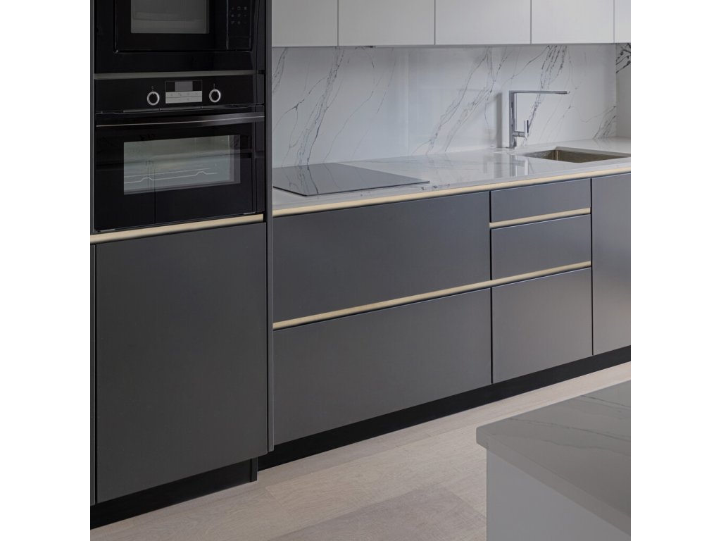 Horizontální Gola profil je elegantním řešením pro kuchyňské sestavy bez viditelných úchytek. Tento profil se osazuje u krajů nábytkových modulů a umožňuje snadné otevírání dvířek pouhým zatažením za přední hranu. Design zachovává minimalistickou estetiku a čisté linie kuchyně, aniž by bylo nutné instalovat klasické úchytky.