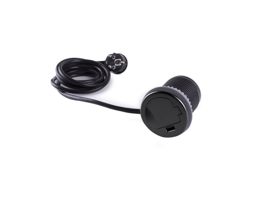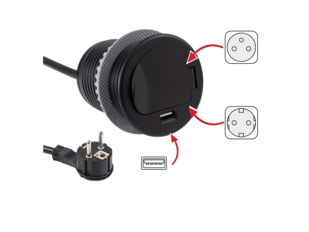 Zásuvka s jednoduchým designem a funkčnosti. Vestavná montáž do pracovního stolu nebo nábytku. Zásuvka 230V je skryta pod krytkou a nabíjecí port USB je stále přístupný.