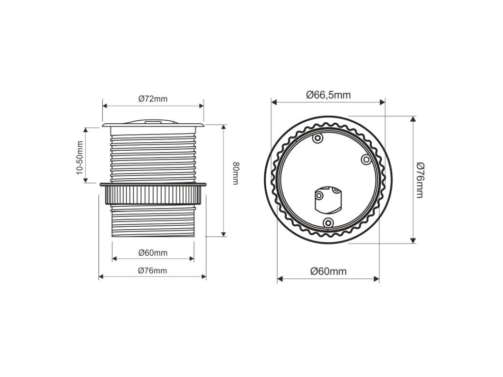 Montážní otvor pro zásuvku je o průměru 60 mm a vestavná hloubka 90 mm.