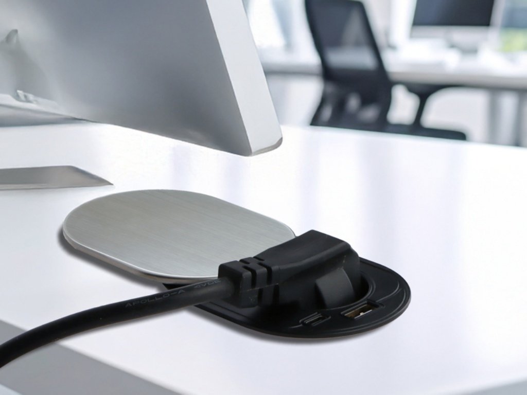 Zásuvka s moderním designem v povrchové úpravě současného trendu imitace nerezi. Vestavná montáž do pracovního stolu nebo nábytku (např. obyvací stěna). Zásuvka a USB nabíječka je v zavřeném stavu zkryta pod posuvnou krytkou.