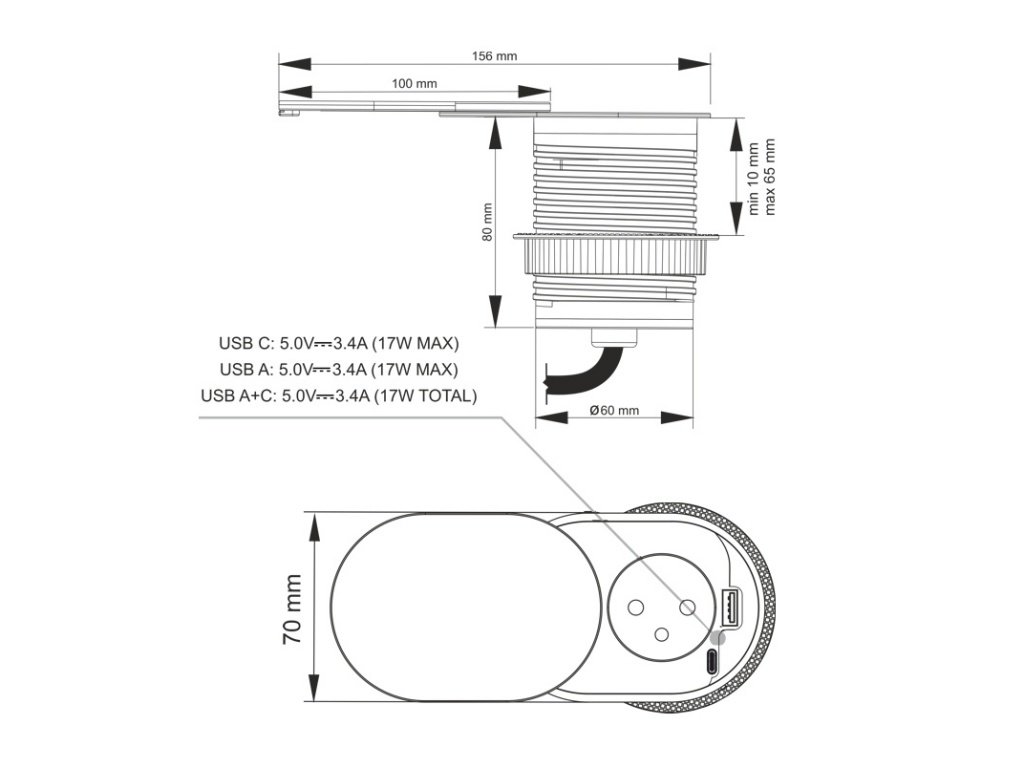 Montážní otvor pro zásuvku je o průměru 60 mm a vestavná hloubka 90 mm.