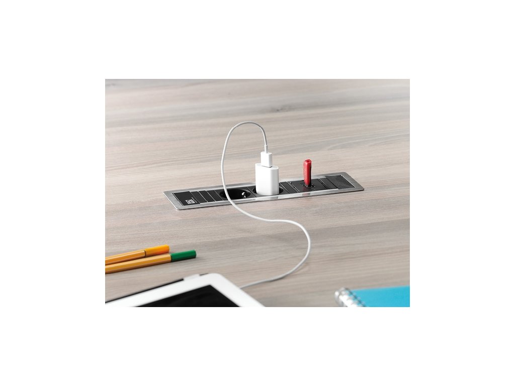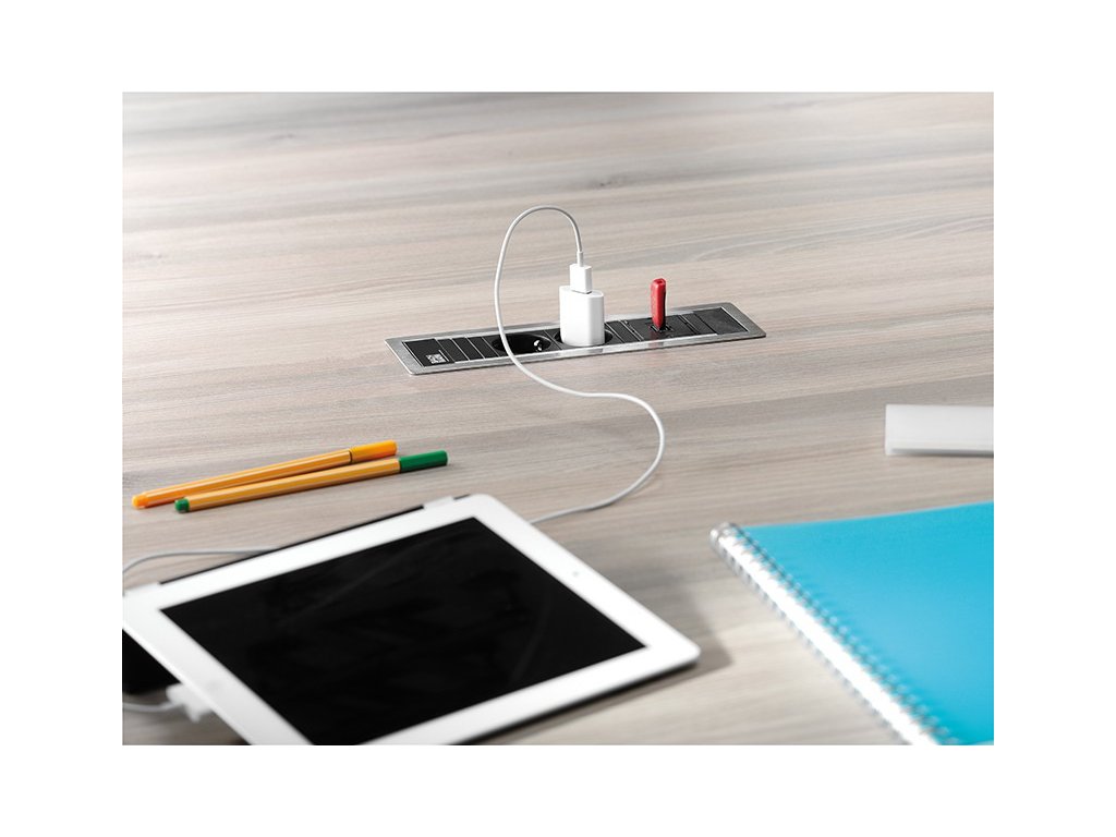Jedná se o kompaktní řešení vestavného a snadno přístupného napájení 230V a datového připojení pracoviště (např. USB, HDMI, datová zásuvka RJ45 apod.) Zásuvková jednotka (viz související zboží) se jednoduše bez použití nástrojů zespodu nacvakne do rámečku. Tento rámeček je určen pro 6 násobné zásuvkové jednotky Power Frame.