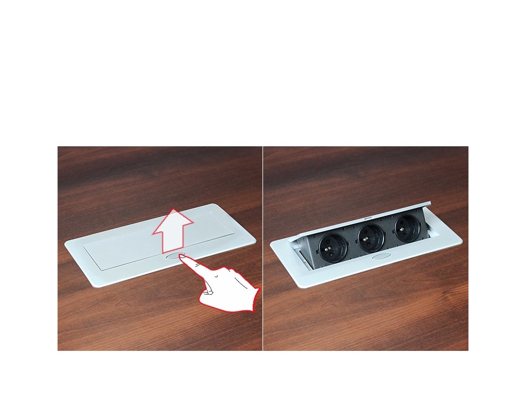 Zásuvka s moderním a ergonomickým designem pro instalaci do pracovního stolu nebo nábytku (např. obyvací stěna). Zásuvky lze využít také v kuchyni v dostatečné vzdálenosti od dřezu. Zásuvka má stupeň ochrany IP20.