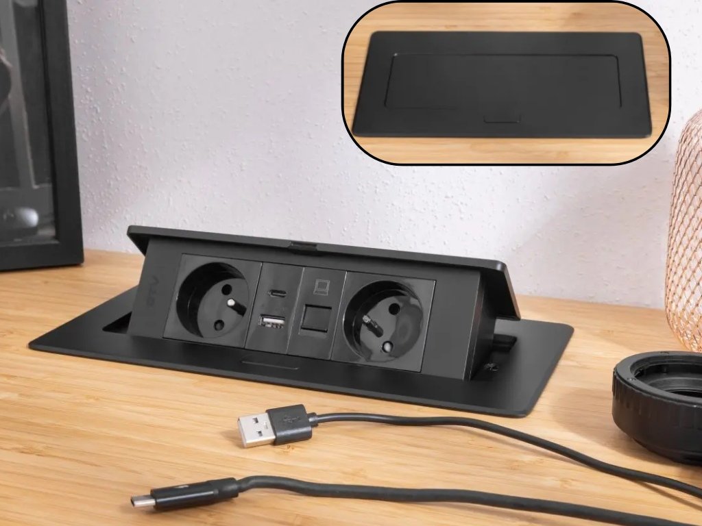 Zásuvka s moderním a ergonomickým designem pro instalaci do pracovního stolu nebo nábytku. Díky vybavení s HDMI a RJ45 se hodí také do open office stolů, kanceláří nebo domácí pracovny.
