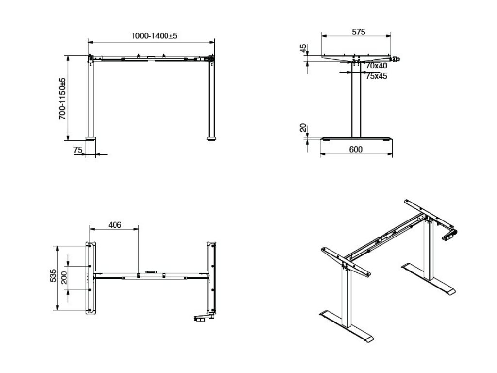 Lze použít pro šířku stolu od 986 až 1400 mm. Výška podnože lze nastavit v rozmezí 700 - 1150 mm.