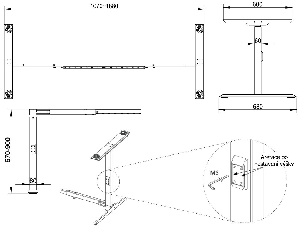 nastavte si libovolně výšku stolu pro lepší pozici k práci. Podnož se nastavuje manuálně na výšku. Elegantní nohy udělají z podnože designový prvek stolu. Po nastavení výšky se podnož zaaretuje pomocí inbusu M3.
