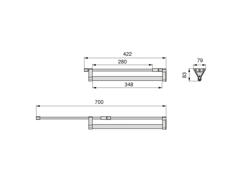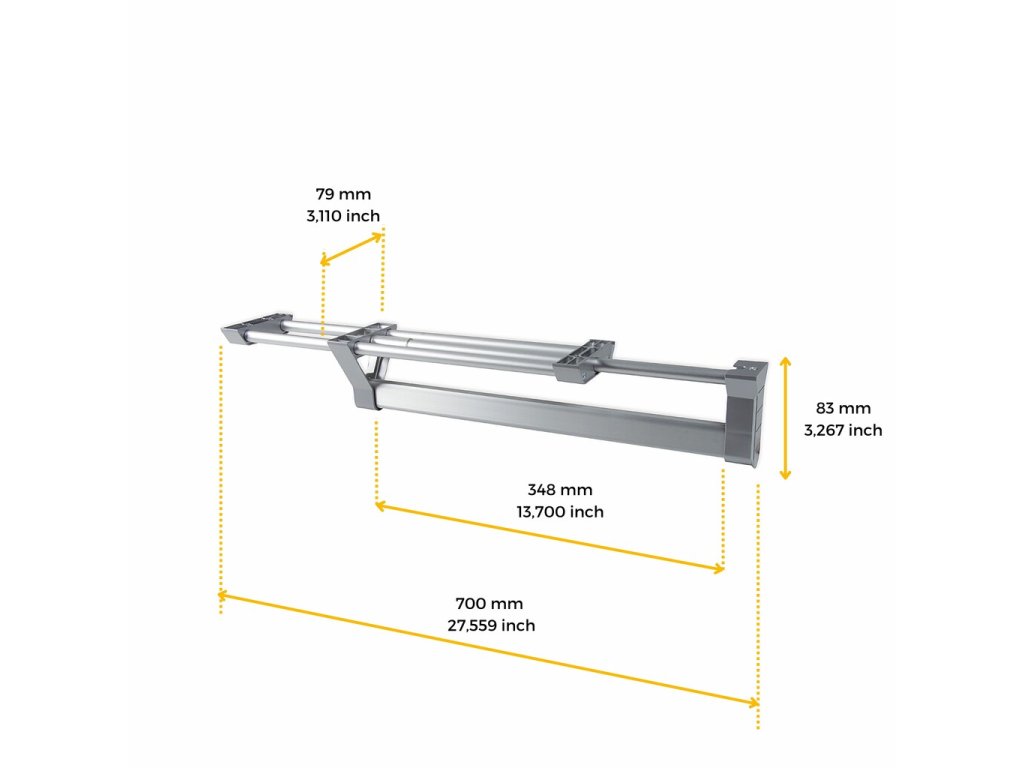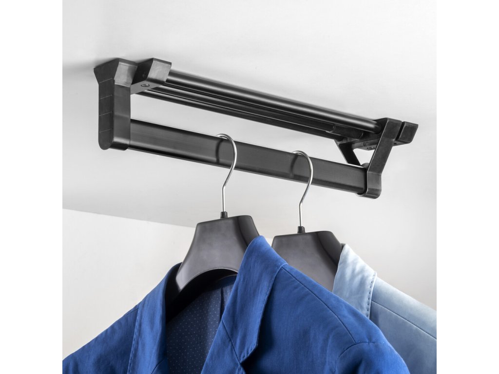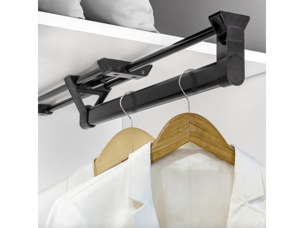 Praktický výsuvný věšák pro přehledné uložení a rychlý přístup k ramínkům. Vysunutím vyjede celý závěs před čelo skříně, takže snadno vyberete i oděvy uložené v zadní části. Robustní hliníkové tělo s matným černým povrchem a odolnými plastovými prvky je navržené pro každodenní používání v šatnách, vestavných i klasických skříních.