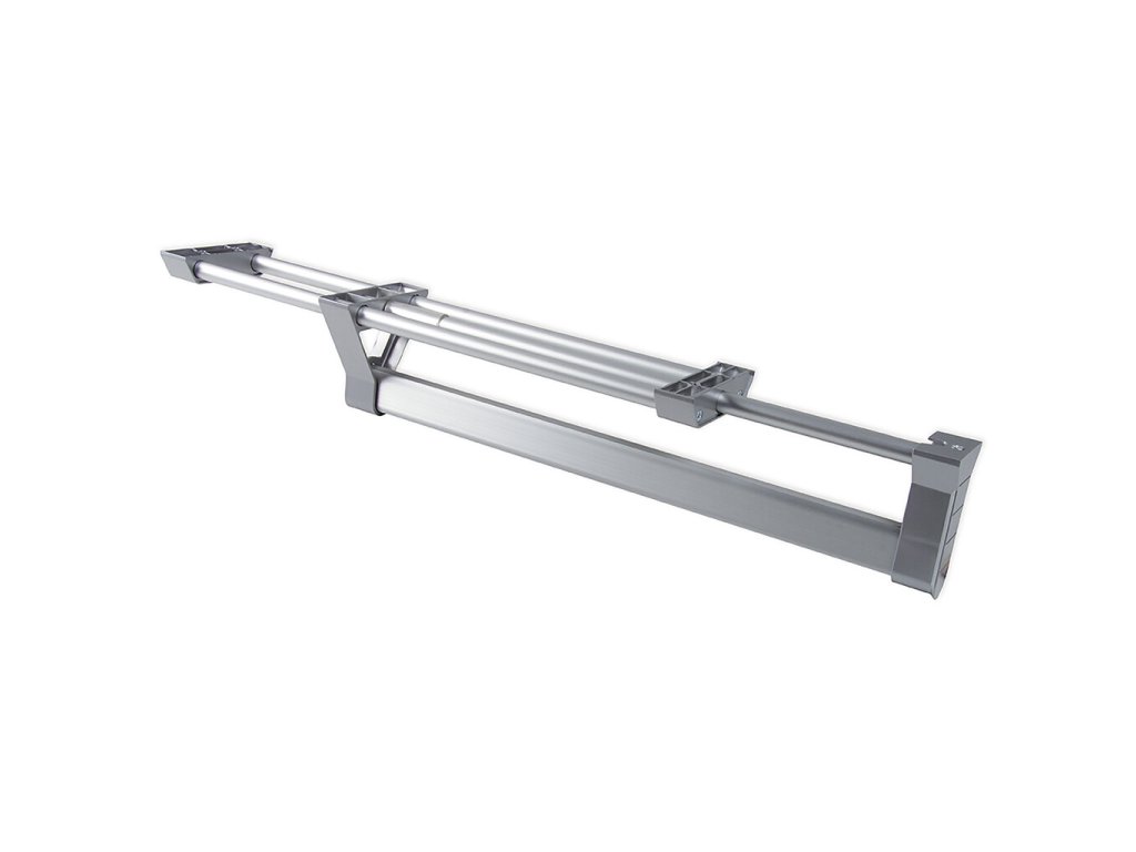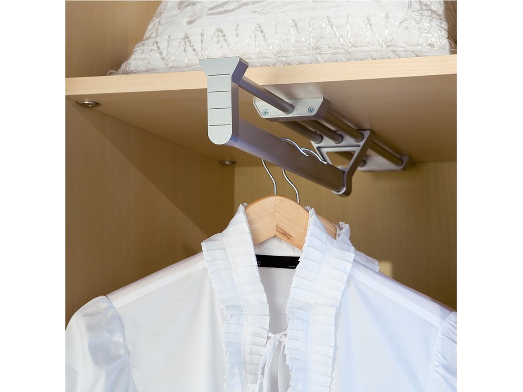 Praktický výsuvný věšák pro přehledné uložení a rychlý přístup k ramínkům. Vysunutím vyjede celý závěs před čelo skříně, takže snadno vyberete i oděvy uložené v zadní části. Robustní hliníkové tělo s matným eloxem a odolnými plastovými prvky je navržené pro každodenní používání v šatnách, vestavných i klasických skříních.