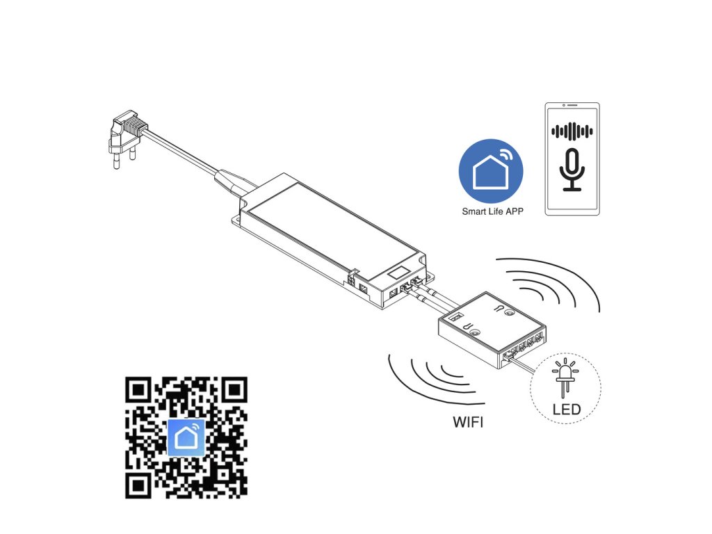 WiFi přijímač Smart je moderní řídicí jednotka pro LED pásky a svítidla napájená 12 V nebo 24 V DC. Umožňuje ovládat světla přes mobilní aplikaci Smart Life, hlasové asistenty i pomocí RF vysílačů Smart (prodávají se samostatně).