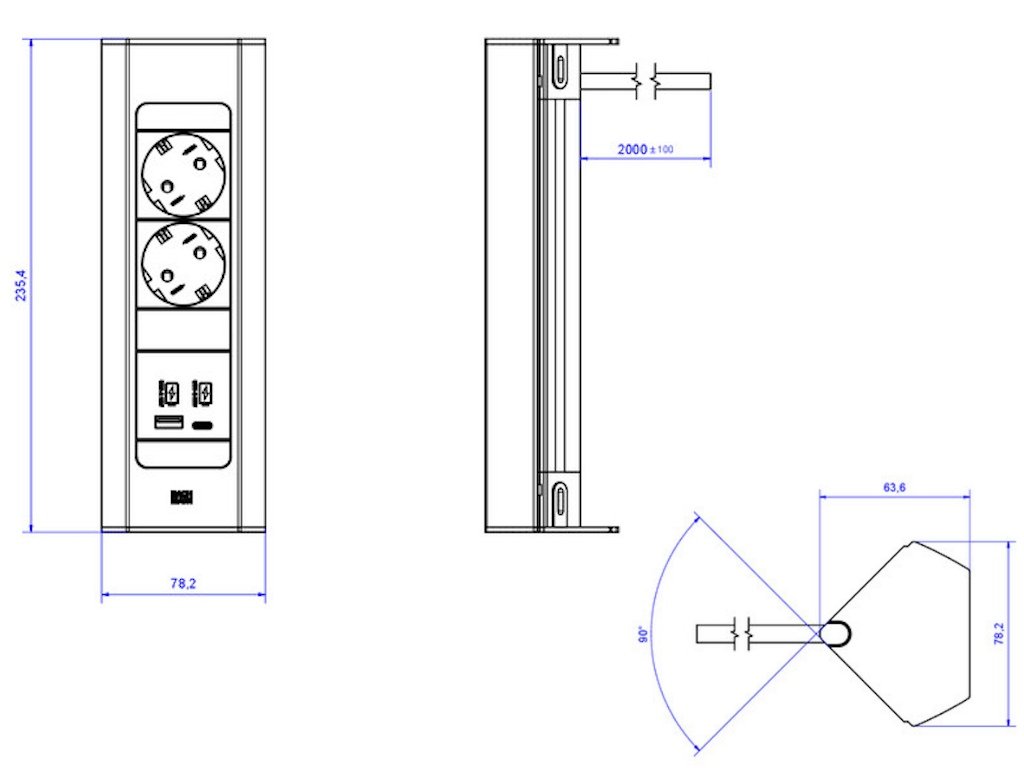 Zásuvka má 2m napájecí kabel s přiloženou vidlicí do zásuvky k přišroubování na vyvedený kabel.